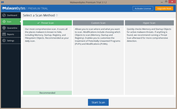 Malwarebytes توصیه می کند ابتدا ابتدا Threat Scan را انجام دهید، زیرا این اسکن معمولا همه ویروس ها را پیدا می کند. بسته به رایانه شما،هر اسکن سریع می تواند 5 تا 20 دقیقه باشد، در حالی که یک اسکن سفارشی ممکن است 30 تا 60 دقیقه یا بیشتر طول بکشد. در حالیکه Malwarebytes اسکن می کند، می توانید ببینید که چند فایل یا اجزای نرم افزار قبلا اسکن شده است و چند فایل از آن به عنوان بدافزار شناخته شده یا به عنوان بدافزار آلوده شده است.